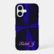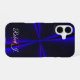 This iPhone 16 phone case features a blue accented geometric clover leaf theme. The case can be personalized with custom text and also features iPhone model case change options.