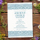 Elegant ancient Greece-inspired Toga Party birthday invitation in blue with stone elements. Perfect for your Ancient Greece or Ancient Rome-themed event!