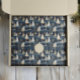 Ein üppiges Wintermuster mit tiefblauen Feldern, überragt von fallendem Schnee, Creme Reh Silhouetten und herzhaften, cremefarbenen Winterkiefern, die die Landschaft abdecken.