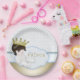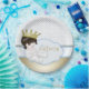 Babyblau und goldfarbener Prinz-Babyduschpapier-Teller mit blau-weißem Perlenhintergrund. Sie können Ihren Text in der gewünschten Schriftart- und Farbgebung anpassen. Einige Grafiken©Delightful-Doodles.