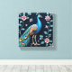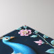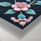 A blue peacock with golden details surrounded by pink flowers and green leaves on a dark blue background, vintage style, symmetrical composition, ornate details.