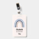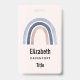 Namensschild mit einem niedlichen und skurrilen Regenbogen. Blau und pfirsichfarben.