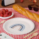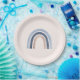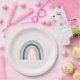 Papier Teller mit einem niedlichen und skurrilen Regenbogen. Blau und pfirsichfarben.