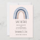 Save the Date Karte mit einem niedlichen und skurrilen Regenbogen. Blau und Pfirsichfarben.
