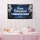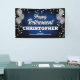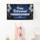 Fun banner sign for indoors or out, featuring festive silver metallic balloons on both sides of the design with sparkly, silver metallic confetti on a rich textured blue background for your personalized retirement party banner.