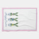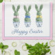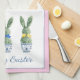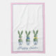 This personalized Easter kitchen dish towel features cute bunny rabbit green topiaries with pink, blue and yellow bows in blue and white chinoiserie flowerpots. Personalize the holiday message with your choice of special text. Perfect decor for your holiday party.