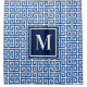 A white and blue Greek key maze pattern with a dark blue and white single letter monogram.