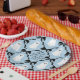 Set des Party-Tisches mit koordinierten Tellern mit einem Muster von fröhlichen, lächelnden Geistern und preppy schwarzen Bandbögen auf einem weichen Baby-blauen Hintergrund. Diese kleinen Geister werden Ihren Tellern ein Lächeln geben, um sie individuell an Ihr Event anzupassen. Sie sind das perfekte Halloween Baby Boo für die Babyduschen von "Fast Due" im Oktober.