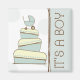 Ein Magnet, der eine Abbildung eines Babyduschkuchens mit einem blauen, braunen und cremefarbenen Muster zeigt und oben eine passende blaue Babytragetasche enthält. Rechts ist blau mit braunem Schnitt. Der braune Text lautet: "Es ist ein Junge." Hintergrund sind schiere blaue Polka-Punkte. Das Zimmer war sehr sauber und sauber. Suchen Sie nach passenden Einladungen und Porto in der Kategorie "Baby" von Jill's Paperie.