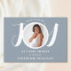 Dieses moderne und stilvolle Baby's Baby Shower Invitation ist mit dem Wort JOY in eleganter weißer Typografie auf einem duskyblauen Hintergrund dekoriert. Einfach mit Ihrem Foto und Ihren Details anpassbar.