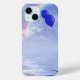 Blaue Ballons und ein Regenbogen im Himmel mit Wasserreflektionen.