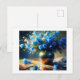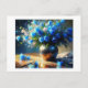 Ein Blumenstrauß mit blauen Blume ist in einer Reflektorvase auf einem Holztisch mit gefallenen Blütenblättern und einem in der Nähe verstreuten Bleistift angeordnet. Die Beleuchtung schafft einen dramatischen Kontrast und hebt die komplizierten Details und lebhaften Farben der Blume hervor.