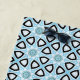 A towel set with a geometric pattern featuring blue, white, and black elements hangs from a rod. A matching washcloth is displayed below, showcasing the design.