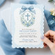 Feiern Sie die Taufe Ihres Babys mit dieser eleganten blauen Einladung mit einem Blumenkranz in Aquarelltönen, einem Kreuz und einem weichen Schleifenbogen. Ideal für Taufen oder Namensfeiern. Vollständig anpassbar mit bearbeitbarem Text und Details. Ein schöner Sake für einen sinnvollen Tag.