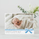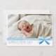 Blue Bow Modern Minimalist Script Baby Photo Birth Dankeskarte