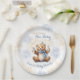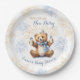 Niedliche und lustige New Year's Baby Dusche Papier Teller mit einem bezaubernden Babybär mit Milchflaschen und Feuerwerk in den Farben Blau und Beige Champagner. Personalisieren Sie den Text einfach. Kate Eden Art