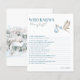 Mit diesem blauen Storchwinters, der Mommy Best Game kennt, macht es Spaß, sich in der Dusche zu amüsieren. Dieses Spiel mit einer süßen Storchsimulation und einem schneebedeckten Winterdorf ist ein perfektes Spiel für eine Babydusche. Die Gäste können die Favoriten von Mama erraten und mehr über sie erfahren, während sie Lachen und Erinnerungen kreieren. Dieses Spiel ist eine charmante Ergänzung zu Ihrem Baby-Duschthema im Winterstorch und koordiniert wunderbar mit Einladungen, Dankeschön-Karten und Zeichen für ein zusammenhängendes Fest.
