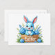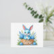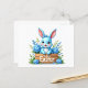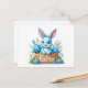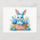 Ein niedlich fröhlicher blauer Hase mit einem Korb von Blume freundlichen Ausdruck wünscht Ihnen viel Glück für Ostern.