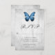 Elegante und einfache Wedding Response Card mit einem blauen Schmetterling vor grauem Grunge Hintergrund. Dieses trendige Design ist eine einzigartige Wahl für eine moderne Hochzeit. Einfach an Ihre Hochzeitsdetails anpassen. Klicken Sie auf "Anpassen", um weitere Personalisierungsoptionen zu erhalten.