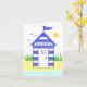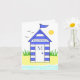 Strandhütte, blau gestrichen, stehend in den Sanddünen am Strand in der Sommersonne. Anpassbare Geburtstagsnachricht und Initial.