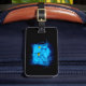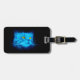 Ein fraktalisiertes blaues Katzengesicht mit atemberaubend gelben Augen vor schwarzem Hintergrund.