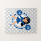 Niedliche schwarzhaarige Cheerleader in Blue mit grauem Akzent Hintergrund.