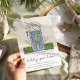 Die charmante Urlaubsparty-Einladung beinhaltet eine gezeichnete blaue Türillustrierung, flankiert von grünen Büschen, mit handgeschriebenen Schriftzeichen vom "Ferienhaus offen für den Urlaub". Personalisieren Sie Ihre Weihnachts-Party-Details unten.