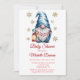 A whimsical watercolor illustration of a Christmas gnome in a blue and white winter theme. The gnome wears a tall pointed hat with a blue and white gradient pattern and small white snowflakes. The hat has a pointed tip and a curved brim. The gnome has a large round pink nose, a long white beard, and is decorated with a string of red berries across its chest. The gnome is holding a glowing red lantern with a warm yellow light inside. The background features golden snowflake patterns scattered around the gnome. The snowflakes are detailed with intricate star patterns and vary in size. The gnome's body is painted in a blue and white watercolor style with subtle texture and shading. The overall illustration has a soft, painterly quality with white space around the elements. The composition is centered with the snowflakes creating a festive border around the gnome.