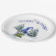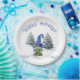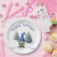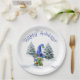 Niedlicher Weihnachtsgnom mit einem Urlaubsknom mit Winterkiefern und Silberschneeflocken. Die Hintergrundfarbe kann geändert werden. Text ist bearbeitbar.