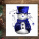 Ein skurriler, niedlicher Schneemann, der in einem blauen Samthut und einer Weste gekleidet ist und zu Weihnachten von blauen Sternen umgeben ist.