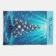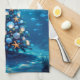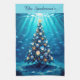 Eine skurrile Unterwasserwelt mit einem Weihnachtsbaum, der mit goldenen Seestern und leuchtenden Muscheln geschmückt ist. Das Sonnenlicht filtert durch das Wasser von oben. Schulen tropischer Fische schwimmen um den Baum herum.