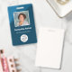 Personalisieren Sie diese senkrechten blauen Abzeichen mit einem Mitarbeiter-Foto, Firmenlogo, Bar-Code, Mitarbeiter-ID und Namen.