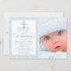 Bleu damassé photo invitation baptême avec croix perle bleu et blanc et élégant script sur un bébé bleu damassé arrière - plan. Cette élégante invitation au baptême damassé bleu est facilement customisée pour votre événement en ajoutant simplement vos photos et détails de l'événement dans le style et la couleur de police, et le libellé de votre choix. Il s'agit d'un design imprimé sans perles réelles, etc.