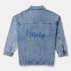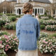 This stylish denim jacket features a name in blue script on the back. The woman's name Marilyn is on the back of the jacket. You can change the name by clicking the Personalize button. This custom women's denim jacket is your personal fashion statement! Personalize it with your favorite image or design and wear your unique style every where you go. Showcase your individuality, with this cotton-blend jean jacket. The denim jacket is made with 90% cotton, 6% polyester, 3% rayon and 1% spandex. This personalized blue denim jacket will make a great gift. You can pay for this denim jacket with 4 interest-free payments with Klarna.
