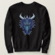 Cooles blaues Drachenpulli mit einer digitalen Illustration des coolen Zauberkopfes mit Hörnern in lila und blauen Farben auf dunkelblauem Hintergrund.
