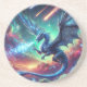 Ein mystischer blauer Drache fliegt durch einen dynamischen kosmischen Himmel, umgeben von Sternenstaub, Schneeflocken und Sternschnuppen.