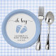 Niedliche Teller für Ihre Babydusche mit "oh boy" in einem stilvollen Drehbuch mit Wimpern und einer blauen Wasserfarbe von Babyfüßen. Unterhalb können Sie sich einfach mit Ihrem Namen und Ihrem Duschdatum personalisieren.