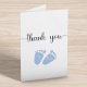 Einfache niedliche Babydusche Dankeschön-Karte mit "danke" in einem stilvollen Drehbuch mit Wimpern und einer blauen Wasserfarbe von Babyfüßen. Im Inneren können Sie einfach Ihre Danksagung personalisieren (oder für eine handschriftliche Notiz leer verlassen) und Ihre Namen in ein signaturähnliches Skript einfügen.