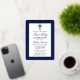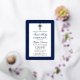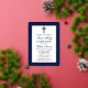 Elegante Navy Blue und Silver First Heilige Kommunion Einladung mit Kreuz. Silberfolie. Silberstreifen. Runde Kanten. Foto zurück.