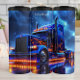 Dieses Bild zeigt einen leistungsstarken blauen Sattelwagen mit lebhaften orangefarbenen Flammen an den Seiten und leuchtenden orangefarbenen Lichtern am Boden. Der LKW ist auf einer nassen, reflektierenden Oberfläche positioniert, die seine Lichter reflektiert und den blauen und lila kosmischen Nachthimmel, der mit Sternen im Hintergrund gefüllt ist.