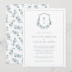 Einladung zur Hochzeitsfeier mit blauem Flor. Diese romantische und stilvolle Hochzeitseinladung besticht durch hübsche handbemalte Aquarellblumen auf einem Wappen | Kranz mit dem Monogramm der Braut und des Bräutigams. Auf der Rückseite der Einladung befindet sich ein skurriles Muster, das aber nach Belieben leicht gelöscht werden kann. Suchen Sie passende Elemente in der Dusty Blue Mit Monogramm Wappen Collection.
