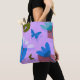 This modern tote bag features a soft blue and purple floral design with a clean, abstract feel.