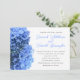 Light blue hydrangea flowers wedding invitations. White paper with black printed text. Full names of the bride and groom are in blue script. The back of the paper is covered in light blue flowers.