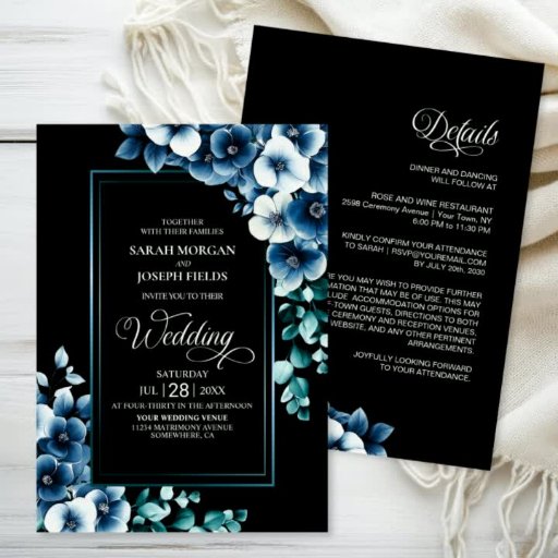 Eine blaue Blumen Hochzeit RSVP Antwortkarte mit Ihrer Einladung für Ihre Gäste, um ihre Anwesenheit zu bestätigen, Menü Vorlieben und Diätwünsche, falls vorhanden, an Ihrem besonderen Tag.
