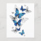 Flying Blue Butterflies Morpho und weiße Schmetterlinge auf einem hellen abstrakten Hintergrund. Morpho. Design mit blauen Schmetterlingen Morpho.
