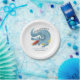 Niedliches Alligator Thema Geburtstagsparty Papier Platte mit einer Illustration eines blauen Krokodils mit einem Party Hut mit der handgeschriebenen Text "Chomp, chomp" Perfect for a boy's Party im Sommer.