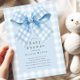 Feiern Sie die bevorstehende Ankunft Ihres kleinen Mädchens mit unserer bezaubernden Blauen Gingham Bug Baby Dusche. Dieses reizvolle Design zeichnet sich durch einen Coquette-Bogen aus, der eine Touch von Eleganz und Launen verleiht und die Freude dieses besonderen Anlasses perfekt einfängt. Machen Sie Ihre Babydusche unvergesslich mit dieser bezaubernden und stilvollen Einladung, die Ihre Liebe und Vorfreude auf Ihr neues Freudenbündel widerspiegelt.
