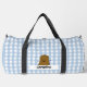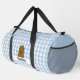 Bezaubernde Duffeltasche mit einer niedlichen, fröhlichen Cartoon braunen Kartoffel. Der Hintergrund ist ein niedliches, klassisches Muster von blau-weiß Gingham. Eine Vorlage unter der Kartoffel, um Ihren Namen hinzuzufügen.