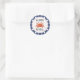 Ein Hochzeitsaufkleber mit einer Abbildung einer Krabbe über einem blauen Gingham-Hintergrund.