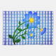 Küchenhandtuch mit dem Bild eines Blumenstraums vor blauem und weißem Gingham-Hintergrund.